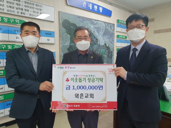 와촌교회(목사 김태훈)에서 지난 달 28일 와촌면행정복지센터를 방문하여 희망2022 나눔캠페인 성금 1백만 원을 기탁했다. 김태훈 목사는 "최근 코로나 19의 매서운 확산세로 주변에 어려움을 겪는 이웃들이 많이 있어 조금이나마 도움이 됐으면 하는 마음에 저희 교회에서 성금을 마련했고, . . .