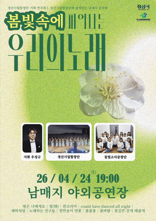 한편, 이번 공연은 누구나 무료로 관람할 수 있는 열린 음악회로 진행되며, 공연 관련 문의는 경산시립합창단(☎053-810-6537)으로 하면 된다.