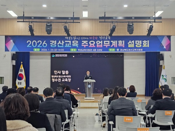 경상북도 경산교육지원청(교육장 정수권)은 1월 23일(금) 14:00 학생교육지원관 2강당에서 학부모 단체 대표자, 관내 교(원)장 등 100여 명을 대상으로 「2026 경산교육계획 설명회」를 개최했다.