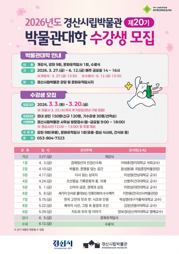 김정기 경산박물관장은 “박물관대학은 지난 시간 동안 시민과 함께 성장해 온 대표적인 문화교육 프로그램”이라며 “20년이라는 뜻깊은 해를 맞아 더 많은 시민들과 함께, 배움의 즐거움과 소중한 추억을 나누고 싶다”고 밝혔다.