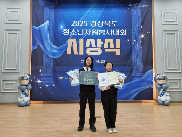 사동중학교(교장 이승연) 행복 두드림 자원봉사단은 11월 14일 안동 그랜드호텔에서 개최된 2025년 경상북도 청소년자원봉사대회에서 최우수 교육감상과 지도자 부문 표창을 받았다.