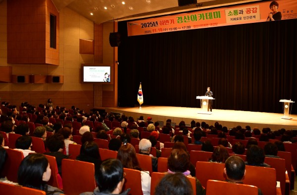 경산시(시장 조현일)는 19일 경산시민회관 대강당에서 시민 600여 명이 참여한 가운데 『2025년 하반기 경산 아카데미』를 성황리에 개최했다. 이번 경산 아카데미는 숭실사이버대학교 학과장 이호선 교수를 초청하여‘소통과 공감, 지혜로운 인간관계’라는 주제로 진행되었다.