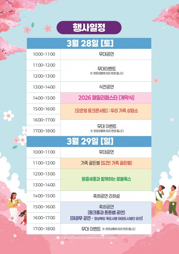 경산시(시장 조현일)는 가족친화적 사회 분위기를 조성하고 결혼·출산·양육에 대한 긍정적 인식을 확산하기 위해 28일과 29일 이틀간 경산 실내 체육관 일원에서 「2026 패밀리 페스타」를 개최한다.