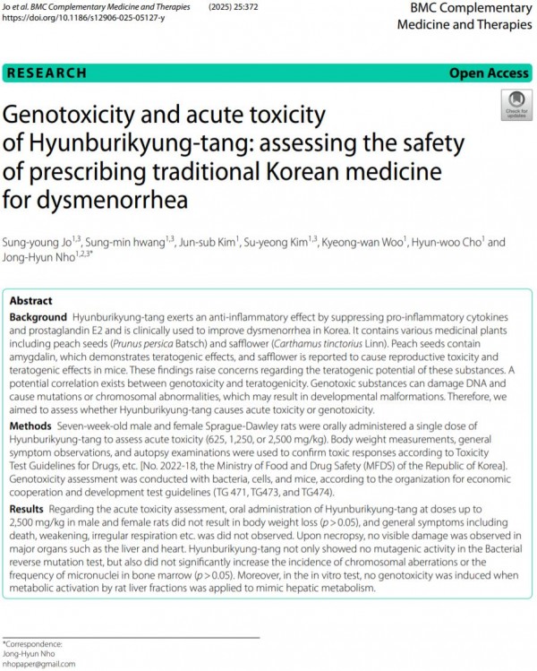 한국한의약진흥원(원장 직무대행 송수진) 한약비임상시험센터 연구진이 월경통 치료에 사용되는 첩약 ‘현부이경탕’의 비임상 안전성 평가 결과를 최근 국제학술지‘BMC Complementary Medicine and Therapies’에 발표했다.