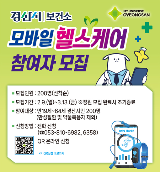 경산시(시장 조현일)는 ICT 기술을 활용해 시민의 생활 습관을 개선하는‘2026년 모바일 헬스케어 사업’ 참여자 200명을 9일부터 모집한다고 밝혔다.
