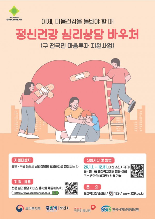 경산시(시장 조현일)는 우울, 불안 등 정서적 어려움이 있는 시민에게 대화 기반의 전문심리상담 서비스를 제공하는 「정신건강 심리상담 바우처사업」을 시작한다. 이 사업은 전문적인 심리상담 서비스 바우처를 제공하여 시민의 마음 건강을 돌보고 자살을 예방하며, 정신질환을 사전 예방하는 것을 목적으로 한다.