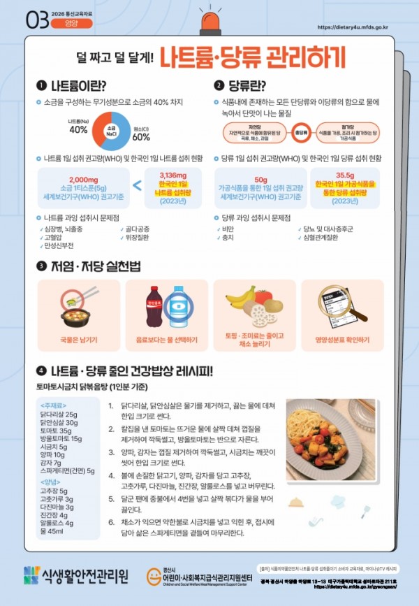 나트륨. 당류 관리하기 페이지 정보 작성자 경일신문 댓글 0건 작성일 26-03-03 11:23 목록 본문 3월 가정통신문 이전글재가에서 완성하는 의료 돌봄 가정 전문 간호 방문 서비스 26.03.04 다음글경산시, 「아픈 아이 병원 동행 서비스」본격 운영 26.03.03 댓글 0 댓글목록 등록된 댓글이 없습니다.