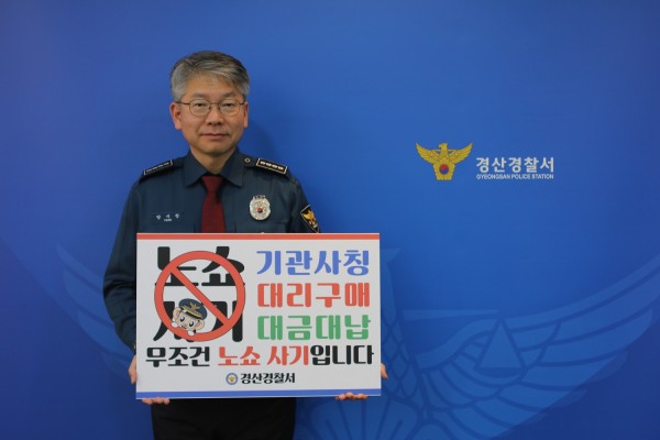 피켓에는 ‘기관 사칭, 대리 구매, 대금대납 반드시 확인하세요!’ 등 노쇼 사기 예방 문구가 안내되어 있다. 첫 주자로 경산경찰서장이 참여한 후 다음 주자로 경산시장이 챌린지에 동참할 예정이다.