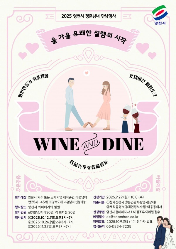 영천시(시장 최기문)는 오는 1012, 1026, 112일 세 차례에 걸쳐 관내 와이너리에서 미혼남녀를 위한 특별한 만남 프로그램 ‘2025 영천와인&다인(wine&dine)’을 연다.