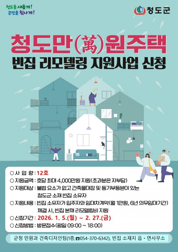 사업을 희망하는 빈집소유자는 227()까지 청도군청 민원과 건축디자인팀 또는 빈집 소재지 해당 읍·면사무소로 신청하면 된다.