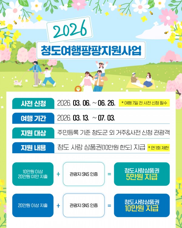지원 대상은 청도군 외 지역에 주소를 둔 관광객이며, 신청은 오는 3 6()부터 626()까지 진행된다. 참여를 원하는 관광객은 여행 예정일로부터 최소 7일 전까지 청도군 홈페이지(문화관광-청도여행상품-청도여행팡팡지원-지원신청)를 통해 반드시 사전 신청을 완료해야 한다.
