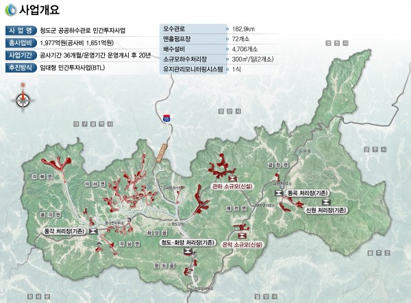 지난 1125, 청도군은 하수도 보급률 확대를 위해 군정 사상 최초 BTL 형식의 민자사업으로 청도 공공하수관로 민간투자사업(BTL) 민간투자사업심의위원회 심의를 통과했다. 청도군은 12월 중 3자 제안공고 이후 관련 절차를 통해 내년 초 우선협상대상자를 선정할 계획이다. 해당 사업은 내 하수도 미처리구역에 하수관로 183, 배수 설비 4,700가구, 맨홀 펌프장 70개소, 소규모 처리장 2개소 등을 설치하는 사업이며, 청도군은 2024 국회 본회의에서 한도액 2,025억 원을 승인받아 사업을 확정지었고, 2027 1 본 사업을 착공하여 202912월 준공하게 된다. 청도군은 본 사업을 통해 현재 64%인 관내 하수도 보급률을 2029년 사업 완료 후 88%로 혁신적으로 확대할 것으로 예상한다.