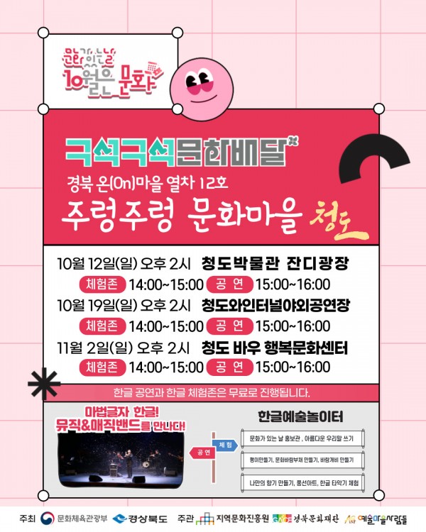 2025 문화가 있는 날 <구석구석 문화배달> 경북 온(On)마을 열차 12호 청도군 ‘주렁주렁 문화마을’가 10월 문화의 달을 맞아 총 3회의 공연을 선보인다. 이번 행사는 문화체육관광부와 경상북도가 주최하고, 지역문화진흥원·경북문화재단·예술마을사람들이 주관하며, 청도군과 협력해 진행된다.
